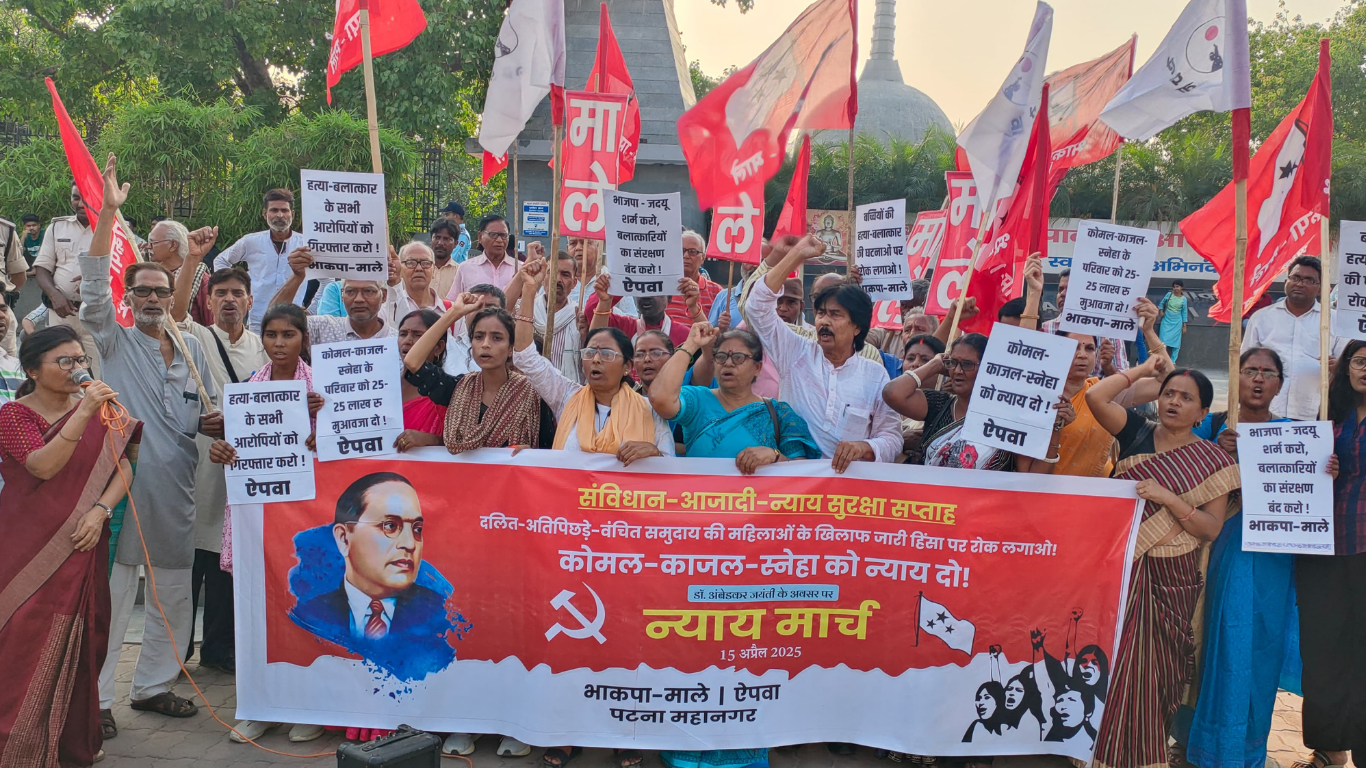 तीसरा पक्ष ब्यूरो : पटना में 15 अप्रैल 2025 को ऐपवा और पार्टी के संयुक्त आह्वान पर दलित-वंचित महिलाओं के लिए न्याय मार्च आयोजित किया गया. यह आयोजन डॉ. भीमराव अंबेडकर जयंती के अवसर पर चल रहे संविधान-आजादी-न्याय सुरक्षा सप्ताह के अंतर्गत किया गया . कोमल, काजल और स्नेहा को न्याय दो नारे के साथ पटना के जीपीओ गोलंबर से न्याय मार्च निकली। इस मार्च में शामिल महिलाओं ने सरकार बदलने का जोरदार आह्वान किया.
